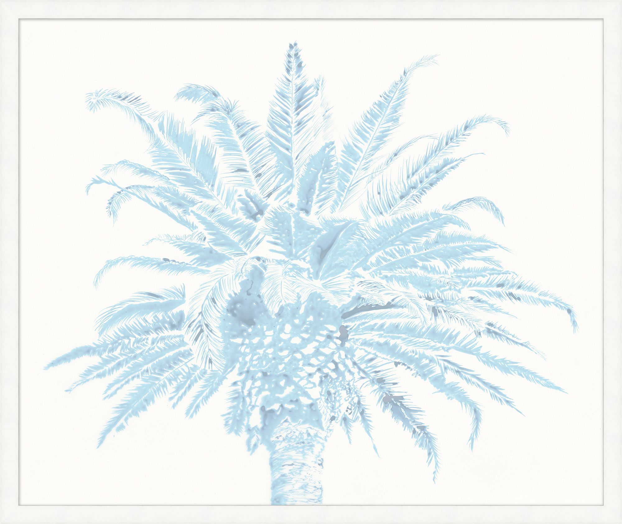 Bimini Palm 1 features soft coastal blues and white on matte paper with a matte white frame. Artwork can be sized custom sized to fit your space.