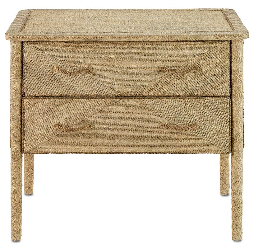 The Kaipo Rope Two-Drawer Chest is wrapped artistry with its exterior and drawer-fronts covered painstakingly in Abaca rope. The heftier rope drawer-pulls give this piece a nautical feel. The rope chest is one of our artisanal pieces that requires great skill to create, as the sisal is painstakingly hand-applied to each piece.