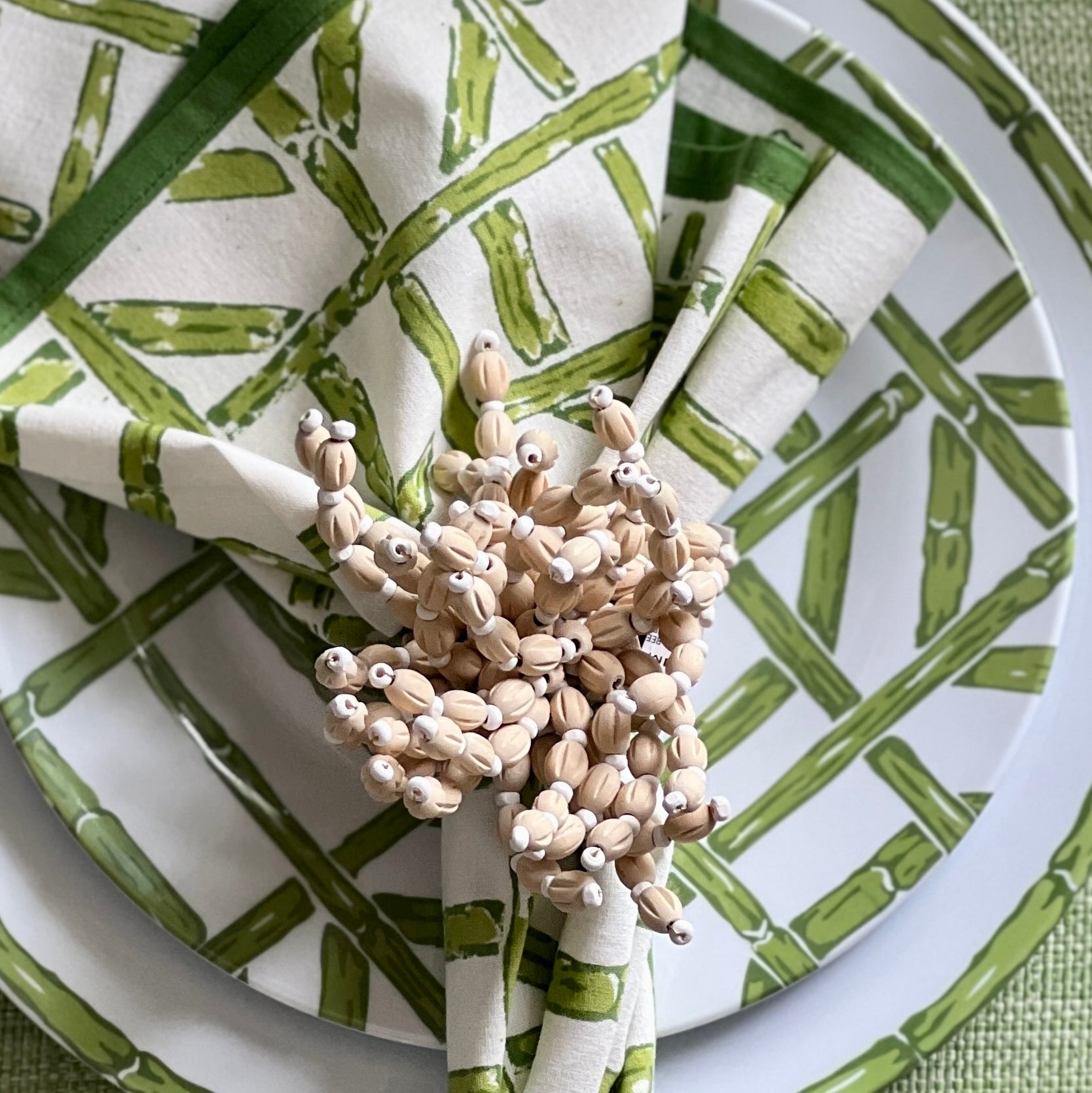 The hand-made, wooden beaded Reed Napkin Ring is the perfect addition to any beachy setting. Wooden beads are hand-arranged in a sea-inspired spray and sit atop a wooden square base.