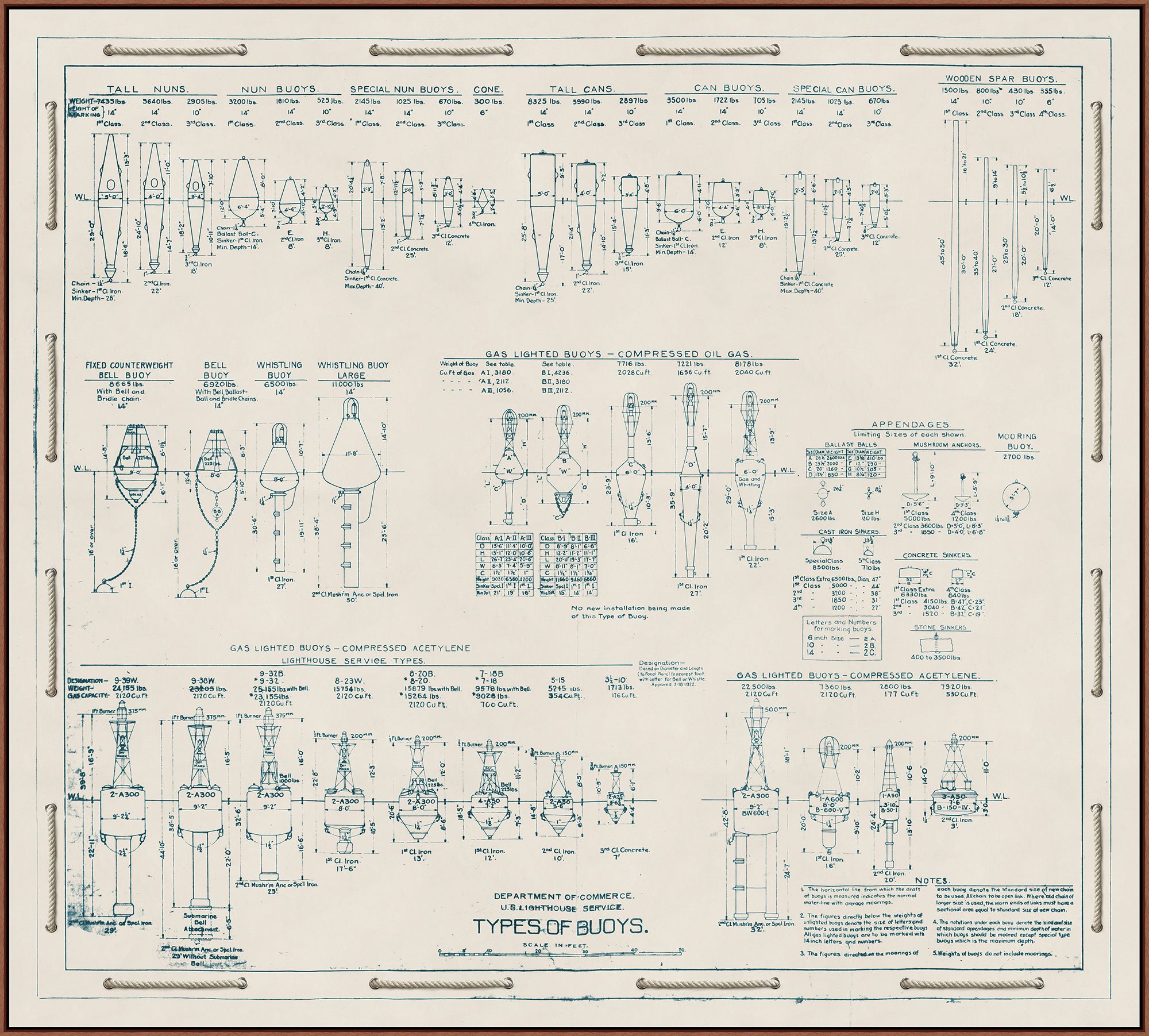 Buoy Chart is framed with Grommets and Rope. Great selection for the boating enthusiast. The Vintage Style is perfectly suited for a home or business office, or any interior nautical space.