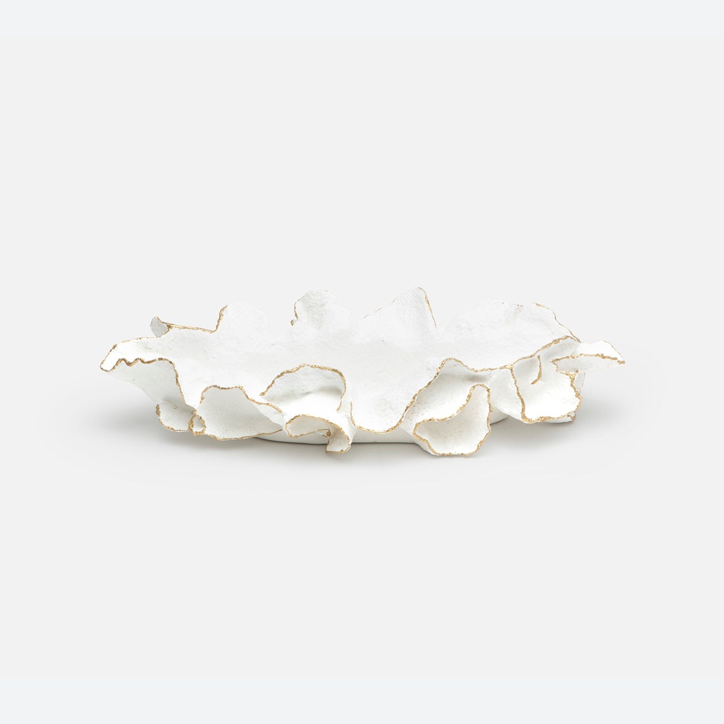 Artfully reproduced coral in the shape of a tray with gold trim.