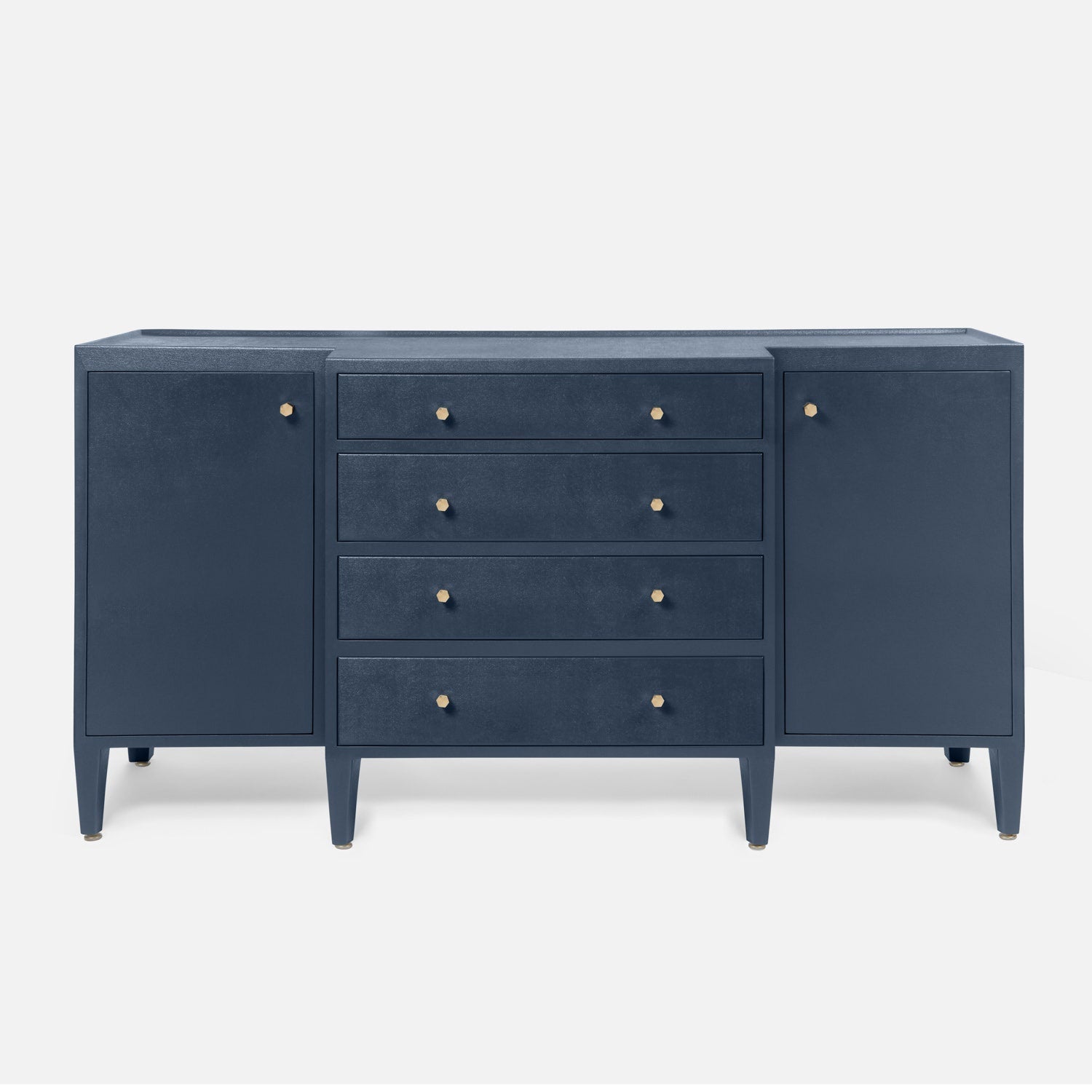 Designer white faux Belgian linen wraps this gorgeous deep drawer buffet. Bottom-mount European glides and the lip element around the top surface are among this piece's many considered details.