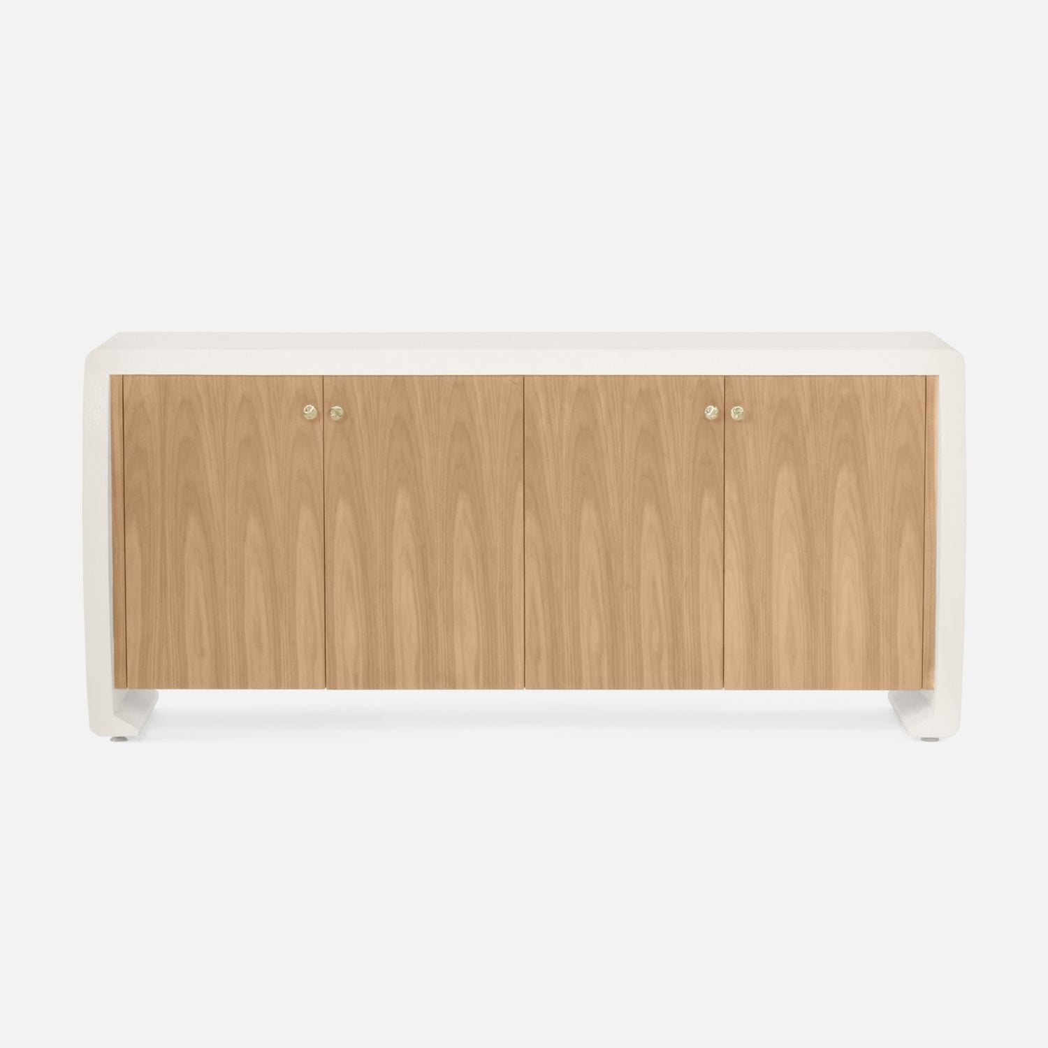 The four light bleached oak veneer doors appear to float within our Verona buffet, where the stunning natural wood grain truly stands out. The contrasting pristine faux shagreen frame shows a sleek curved edge that protrudes out, creating a strong statement in any setting.